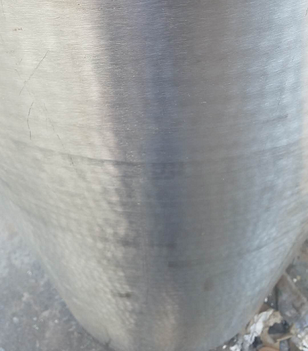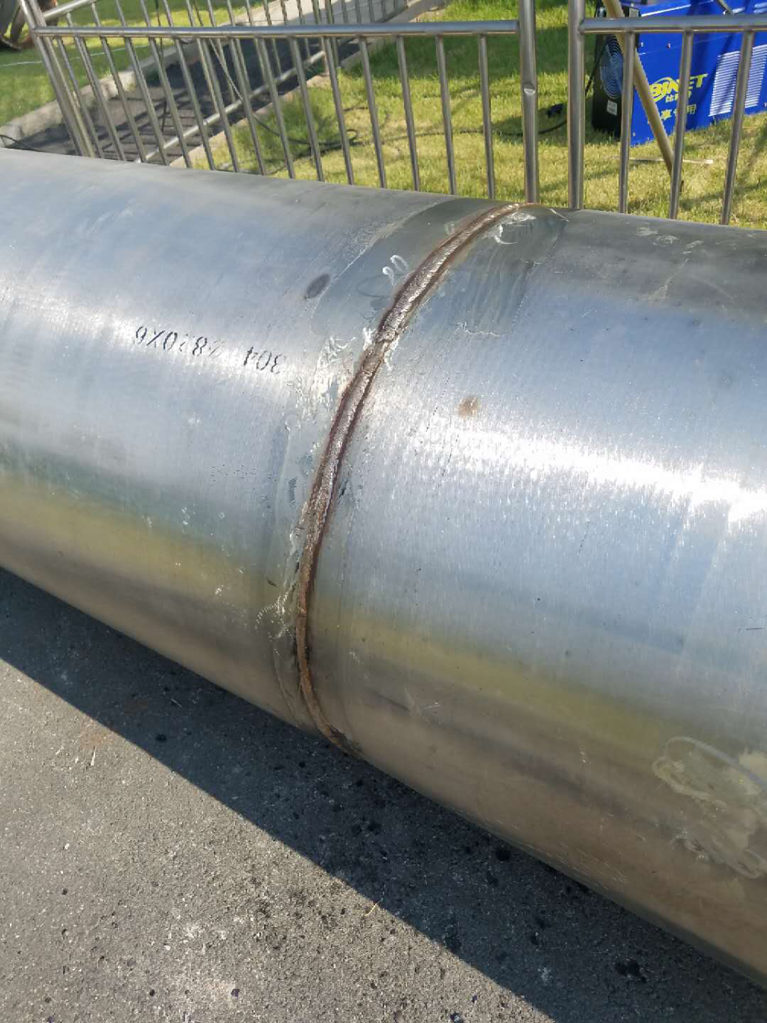 煙囪主管焊接好后對焊口用不銹鋼酸洗膏進行酸洗鈍化處理,由于不銹鋼酸洗膏的主要是硝酸、硫酸、磷酸、氫氟酸等多種酸的混合物作為腐蝕氧化層的主要成分,能夠去掉焊口焊渣的黑色物質(zhì),讓焊口光亮如新,且在焊口位置根據(jù)不銹鋼的抗腐蝕陛性能能發(fā)生鈍化反應(yīng),形成一層極薄的(約1nm)致密的保護膜保護焊口,使得焊口更美觀并提高耐腐蝕性能