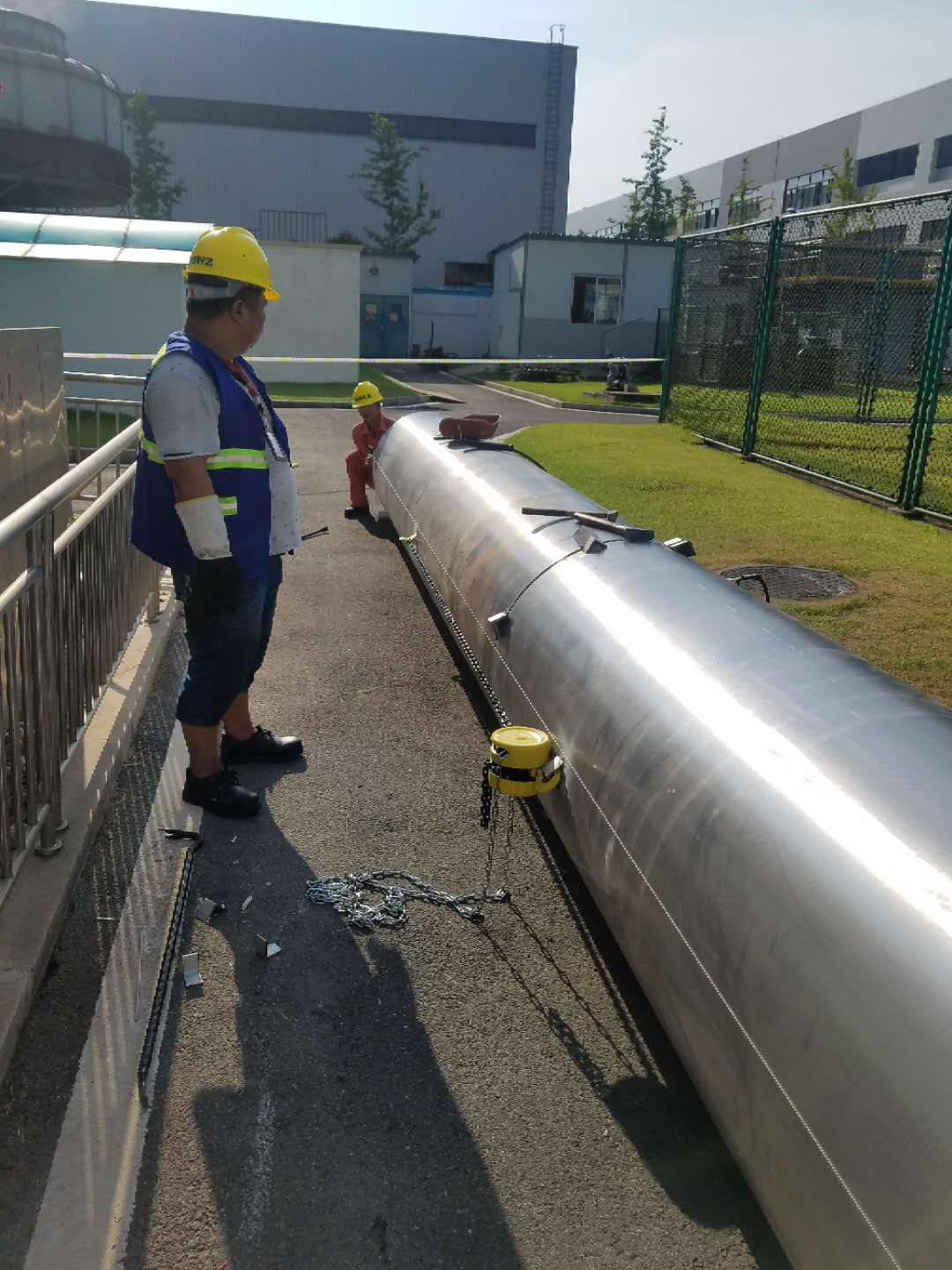康寶萊星沙工廠鍋爐煙囪使用已達五年之多,原設(shè)計為5mm厚普通碳鋼材質(zhì),支管ф600mm,主管ф800mm,垂直高度16m。因在2013年經(jīng)過鍋爐節(jié)能改造后,鍋爐排放的煙氣為低溫?zé)煔猓ā?5°),煙道內(nèi)冷凝了大部分冷凝水,而中高溫水是強氧化劑,這樣煙氣冷凝水(含硫)對碳鋼煙囪腐蝕氧化嚴重。經(jīng)過專業(yè)檢測人員對鍋爐煙囪做檢測,只有1.5mm厚 ,存在倒塌安全隱患,并且煙囪頂帽固定支桿腐蝕嚴重,有被狂風(fēng)刮落的安全隱患。由于存在以上的安全隱患,康寶萊公司決定對鍋爐煙囪及材質(zhì)進行更換改造。經(jīng)過多次的對我司考察后,從眾多公司中選取出來,由我星澤公司對承擔(dān)煙囪此任務(wù)。