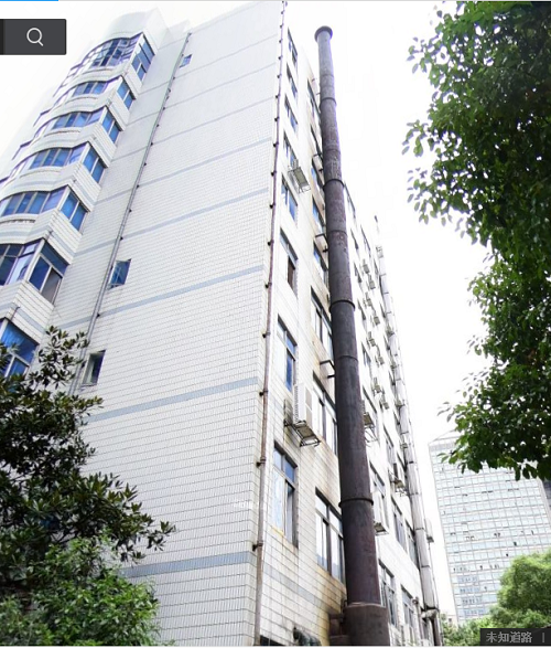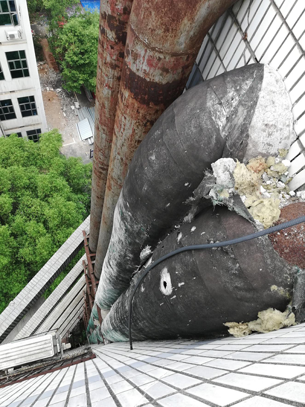 原煙囪(焊接鋼管),管徑約為900mm。沿小區(qū)2棟北外墻靠東豎向安裝,從負(fù)一層一直到樓頂,總高度約36米。