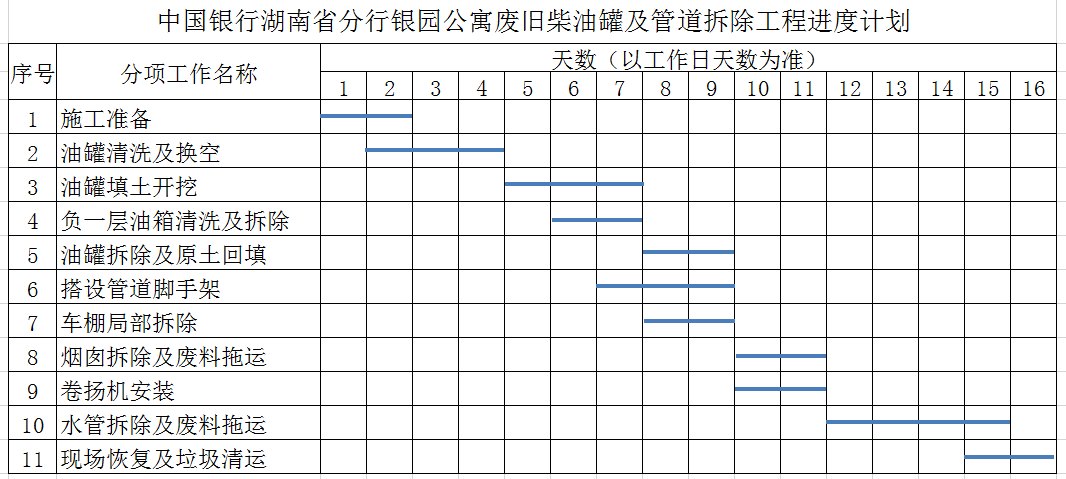 1、工程名稱(chēng):中國(guó)銀行湖南省分行銀園公寓廢舊柴油罐及管道拆除工程