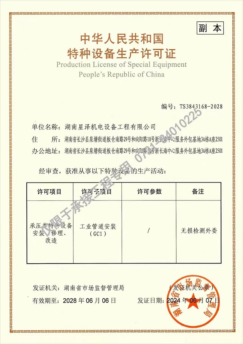 熱烈祝賀湖南星澤 機電設備工程公司取得工業(yè)管道安裝GC1最高資質(zhì)!成績來之不易,感謝省市縣市場監(jiān)督特種設備行政管理部門和協(xié)會給予星澤大力支持,感謝星澤全體員工團結拼搏,不畏艱難,敬業(yè)奉獻的忘我工作。我們要珍惜、愛護企業(yè)的核心成果,在項目管理中始終以謙卑之心,求真務實,精益求精的職業(yè)責任感和神圣使命感,強化TSGD0001-2009《壓力管道安全技術監(jiān)察規(guī)程》為基本準則指導,把《特種設備生產(chǎn)單位落實質(zhì)量安全主體責任監(jiān)督管理規(guī)定》認真落實到質(zhì)量安全體系運行中、確保項目質(zhì)量安全,滿足客戶需求,努力建設星澤著名品牌,鑄造星澤行業(yè)標桿。