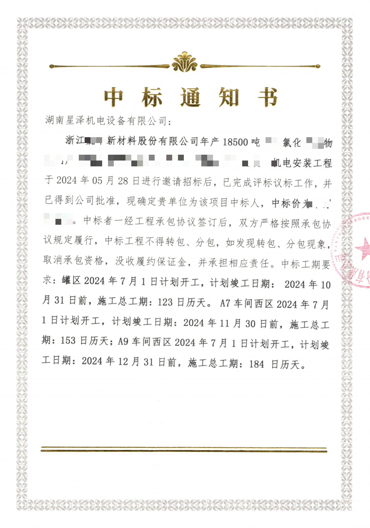 2024年6月13日,公司成功以1300萬(wàn)投標(biāo)報(bào)價(jià),成功中標(biāo)浙江一新材料公司18500噸氯化工項(xiàng)目機(jī)電安裝工程。