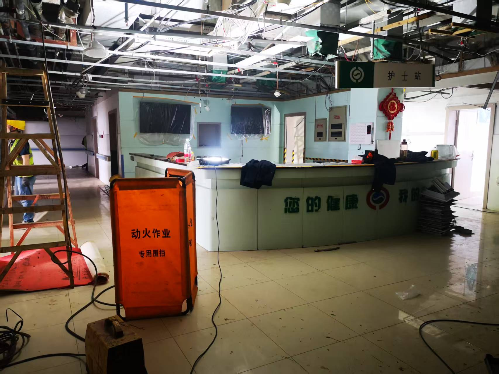 在施工過(guò)程中,項(xiàng)目部施工管理人員精心策劃、日夜堅(jiān)守,嚴(yán)格遵守現(xiàn)場(chǎng)制定的安全制度,并與院方安保力量緊密配合,全方位防范火災(zāi)安全風(fēng)險(xiǎn)。為減少對(duì)醫(yī)院正常運(yùn)營(yíng)的影響,施工團(tuán)隊(duì)采用分區(qū)作業(yè)和夜晚作業(yè)模式,保障門診正常營(yíng)業(yè)的同時(shí),穩(wěn)步推進(jìn)病房的輪動(dòng)改造施工。在使用電錘等電動(dòng)工具作業(yè)上,先與院方溝通約定集中時(shí)段,通知病人注意配合,團(tuán)隊(duì)通過(guò)合理安排,減少對(duì)醫(yī)院診療工作的影響和有效避免噪聲干擾病人休息。施工現(xiàn)場(chǎng)的臨時(shí)封閉設(shè)施更是選用高檔材質(zhì),色調(diào)雅白,與就診區(qū)內(nèi)的建筑設(shè)施和諧統(tǒng)一,若非設(shè)有警告提醒,幾乎難以察覺(jué)正在進(jìn)行施工作業(yè)。