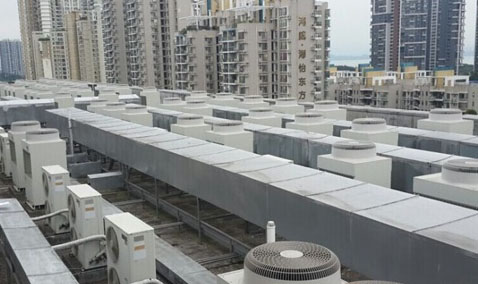 賽博電子廣場中央空調安裝工程建筑面積為106500平米,功能有一至五層為賣場,六層以上為寫字樓和商務居住,中央空調主機采用遠大BZB—250Ⅴ型直燃機組,空調末端采用清華同方吊頂式空調機組,循環(huán)水泵選用上海凱泉產品,水過濾器和電子除圬儀選用長沙多靈公司產品,風管采用江蘇德通復合風管材料,水管保溫采用華美橡塑材料,二臺500T康明冷卻塔安裝于28層頂,戶外管道施工有一定難度!在中央空調安裝室內空調機組時公司采用前后配置消聲器消聲的辦法使設備噪聲降到理想壯態(tài)。