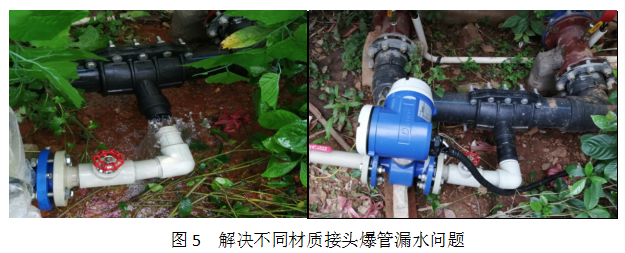 2、管類不一,現(xiàn)場(chǎng)水表安裝的管道材質(zhì)有多種,有鑄鐵管、鋼管、PPR、PVC、PE等,管徑從DN25-DN150不等。由于各種管道的施工工藝不一樣,對(duì)現(xiàn)場(chǎng)技術(shù)人員技能水平提出了一定考驗(yàn)。其中值得一提的是甲方原有一處管道從PE管開了一個(gè)三通,在三通管直接熔接了PPR管,因兩種不同材質(zhì)膨脹系數(shù)不一樣,時(shí)間一久就爆開了。我司施工技術(shù)人員經(jīng)驗(yàn)豐富,使用PE和PPR轉(zhuǎn)換接頭,快速成功的解決了問題,消除了隱患。